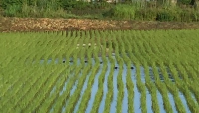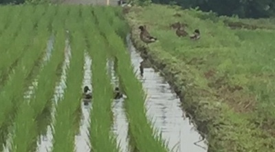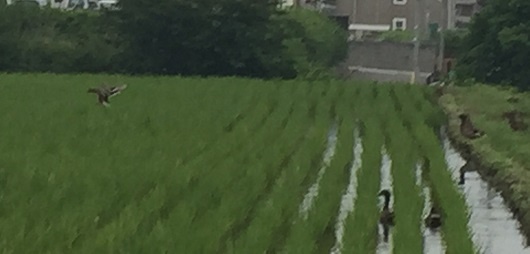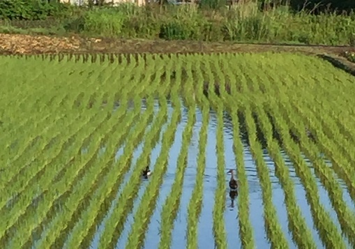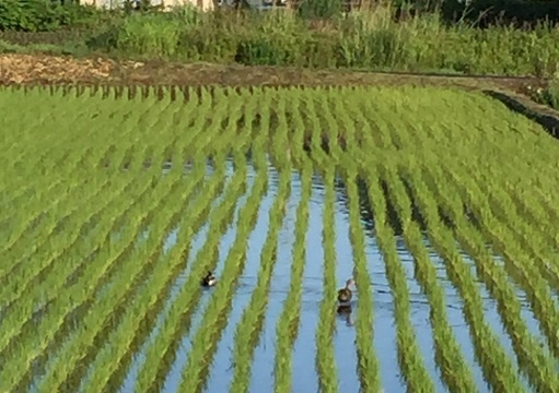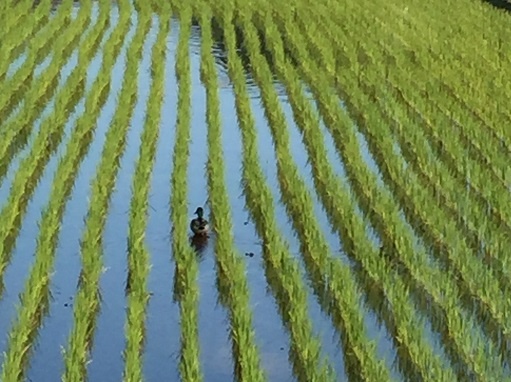 朝田んぼの前を歩いていると、青々と育った稲の間を鴨が泳いでいました。