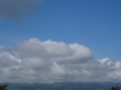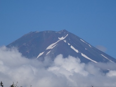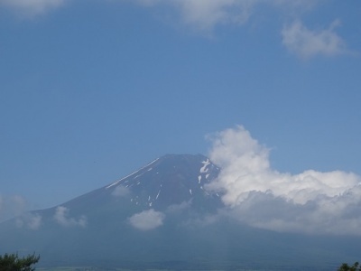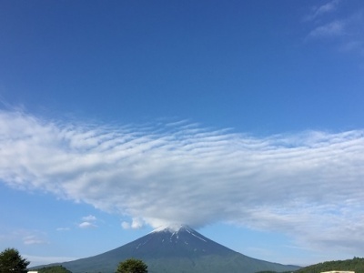 青空の中、雲が富士山に寄ってきてなんだか雲あつめのような、上に雲で出来た「逆」逆さ富士のような感じでした。