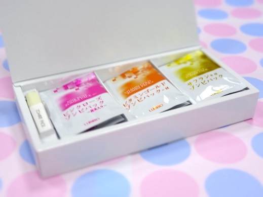 ピンクローズ‐花末入り‐、ビタミンゴールドゾンビパック‐α、サフラン+αの3種類を5gのパウチにして5袋を詰め合わせたお得なタイプの今だけの限定品です。