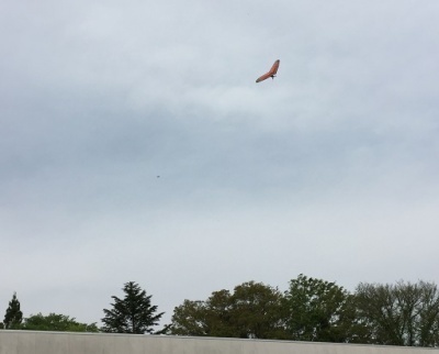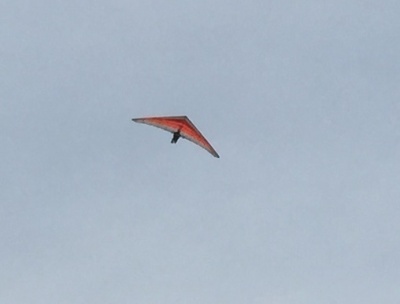 先日工場のハーブのお手入れをしていたら、頭の上の方から大きな叫び声のような音が聞こえるので見上げると空にハンググライダーが飛んでいました。