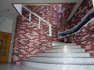 白い外観の建物のエントランス部分は2階までの吹き抜けになっていて壁は赤茶系を中心としたレンガを一面はりめぐらしています。