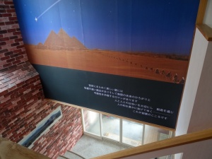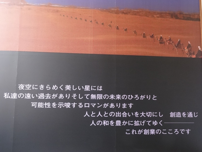 遥か悠久の時代、満天の星空のもと砂漠を交易に向かうラクダに乗ったキャラバン(隊商)の一団と夜空に流れる星を描いた絵が描かれているとともに『創業のこころ』のメッセージが刻まれています。