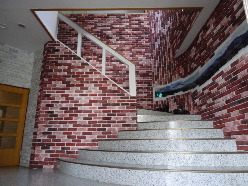 階段を上がる途中、2階部分の反対側を見るとそこには壁一面を使って壁画を張っています。