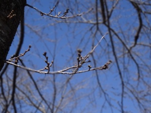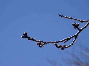 こちら忍野村の中央を流れる桂川の支流、新名庄川(しんなしょうがわ)の両脇に100メートル程のソメイヨシノの並木は、ここ数日の暖かさでようやく蕾が膨らみ始めてきました。