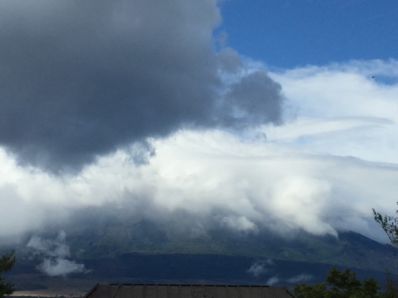 少し山肌が見える富士山上空で黒い雲と白い雲がせめぎ合っているかのようでした。