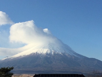 大きな雲がかかっていますが富士山が青空のもと綺麗に見えている富士北麓です。