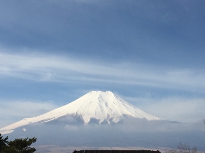 青空に薄い雲、富士山の白さが一段と輝いてみえる富士北麓の朝でした。