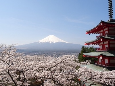 先日、富士吉田市の新倉山浅間公園(通称「忠霊塔」)からの「五重の塔ごしの桜と富士山」の写真を撮ってみました。