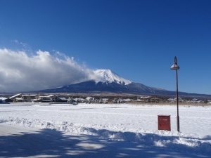 富士吉田市では10cm位でした。忍野村より標高の高い山中湖村ではもう少し多いでしょうね。ほんの少しの標高差でもだいぶ違ってくるようです。道路は交通の多い通りは除雪されていますが幅のない道では除雪で寄せられた雪によって道がより狭くなっていますので注意が必要です。路面も凍って滑りやすい所もありますから気を付けて通行しなくちゃいけません。ほとんどの広い車がよく通る車道など除雪車が通った所はアスファルトが見え普通の状態で通行に支障はありませんが除雪されていない道や日陰の道は車のタイヤで圧雪されいつまでも残り表面が凍り滑るので歩行にも危険な個所が出て来ますのでこの時期は注意が必要です。