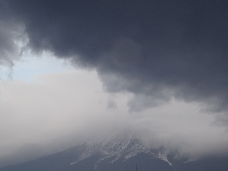その後雲に覆われ見えませんが切れ間から雲の上には青空が広がっているのが見える所があったので、雲上の太陽からの光が頂上の雪に反射してか裾野付近の雲が白く輝いているかのように見えます。