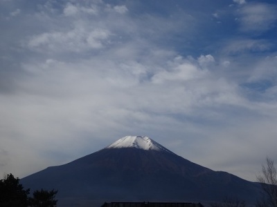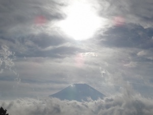 こちらでは朝から曇り空で富士山は雲に隠れて見えませんでしたが、雲が割れ、輝くお日様の下に富士も現れてきました。