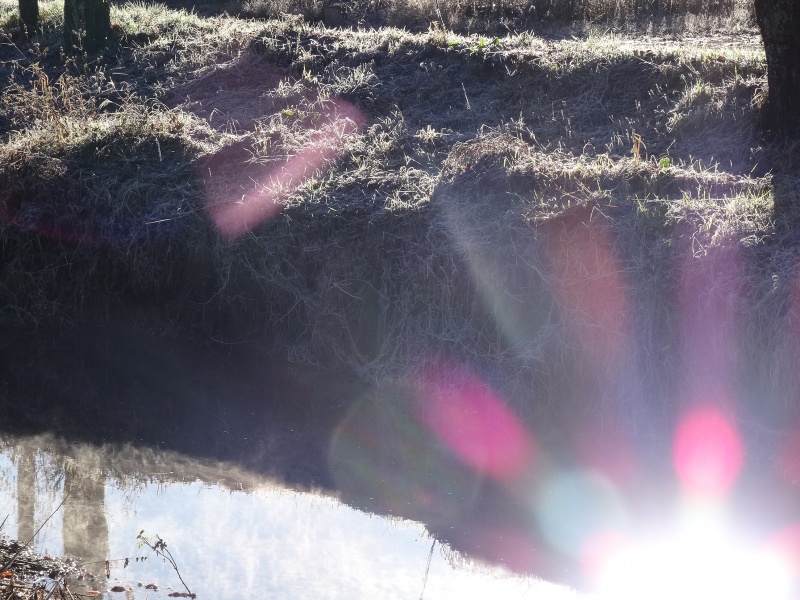 今朝の冷え込みで堤の草や落ち葉にも霜が降りています。