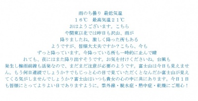 梅雨前線がまた南より北上し始めましたね。また梅雨空に戻っていきそうですね。