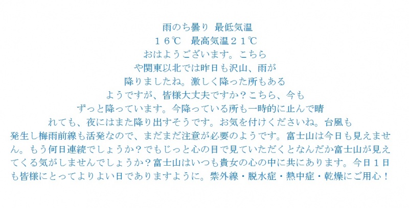 今週も広い範囲でまだ梅雨の晴れ間がしばらくは続くそうですが今日は列島の南北では雨の所もあるようですね。傘をお忘れなく。
