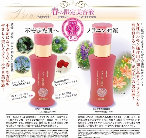 ベリー系エキス・深海由来成分・ペプチドたちの「保護力」と13種のアミノ酸・ヒアルロン酸たちの「保湿力」でしっかりと春の肌をガードし、開放的になる『春』を肌も心も季節に合わせて楽しんで頂きたい願いから生まれた美容液です。