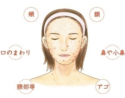 額の中心に集中することが多く白ニキビが多くみられる。女性ホルモンの不足や生理不順などホルモンのバランスの崩れによることが多いようです。