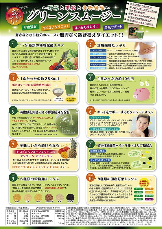 青臭さがなく、飲んで美味しい「トロピカルフルーツミックス味」ですので、これなら野菜嫌いの方でもOK!しかも、ご家庭で野菜や果物をカットしたり、ジューサーをお掃除する手間も省けます。水溶性食物繊とサイリウムハスク(オオバコ科植物の種皮)の食物繊維を主成分に、おから粉末、172種類の植物発酵エキス等を配合。